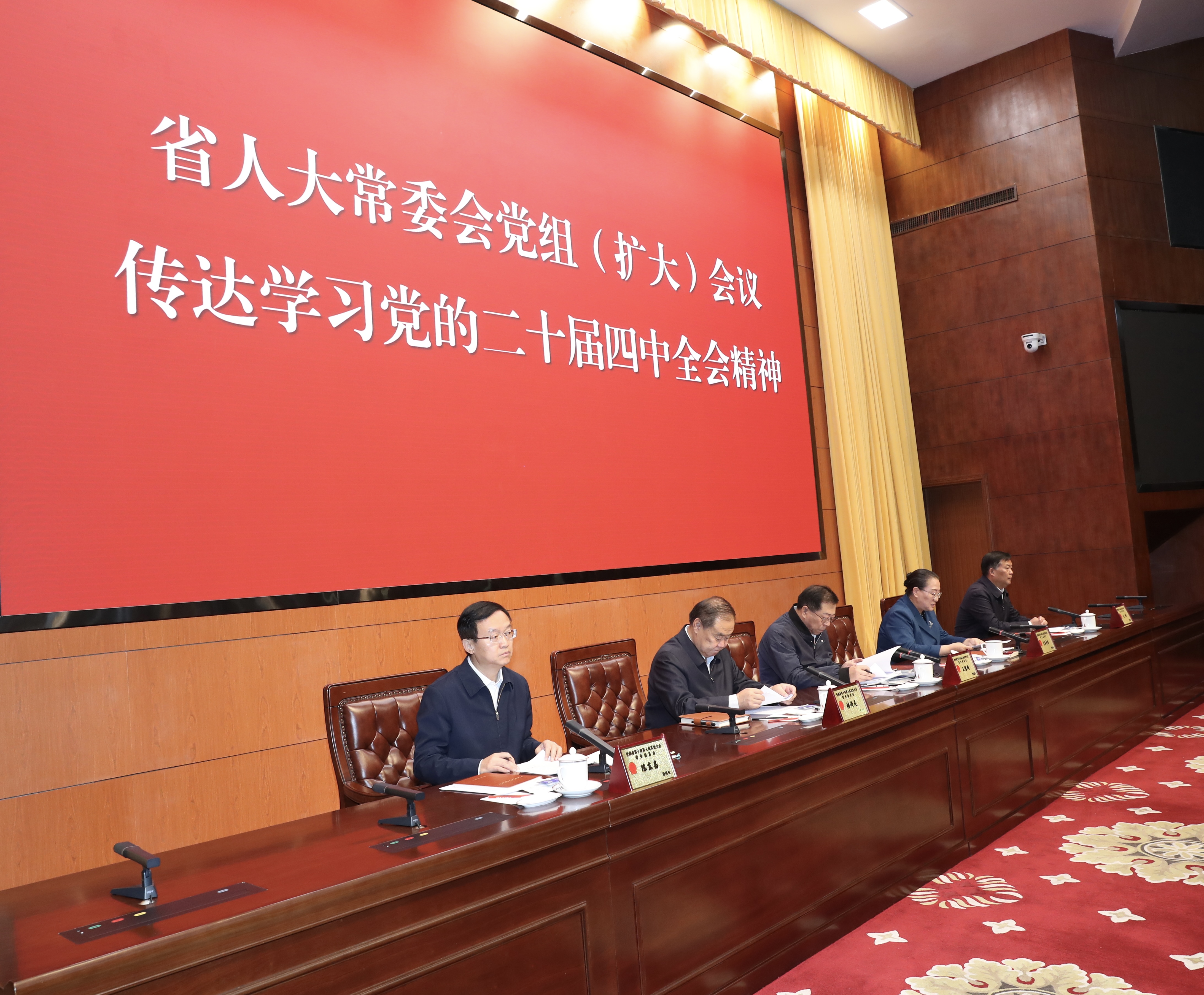 10月30日,省十四届人大常委会党组召开第五十二次(扩大)会议,专题传达学习党的二十届四中全会精神。省人大常委会党组书记、副主任王黎明主持会议。尼玛卓玛、张黄元、吕刚、陈东昌及省人大机关全体党员干部参加会议。